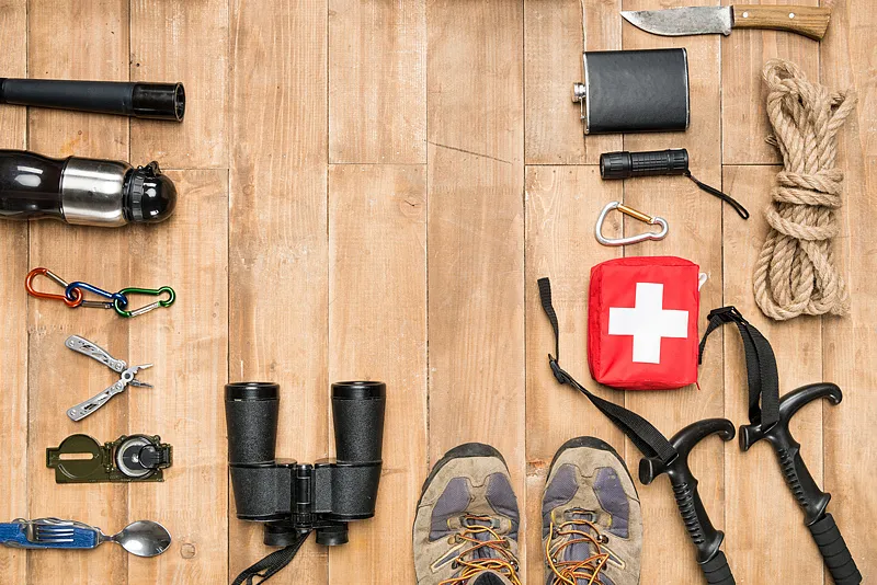 携带好装备物资,包括衣物、食品、饮料、应急药品、常用登山工具、手机及移动电源等。